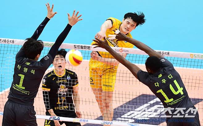 2020-2021 프로배구 V리그 KB손해보험과 현대캐피탈의 경기가 27일 의정부실내체육관에서 열렸다. KB손해보험 김정호가 현대캐피탈 차영석,다우디의 블로킹 사이로 스파이크를 강타하고 있다. 의정부=최문영 기자 deer@sportschosun.com /2021.01.27/