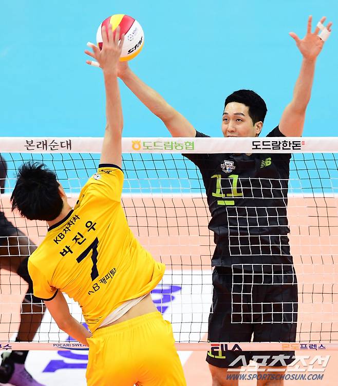 2020-2021 프로배구 V리그 KB손해보험과 현대캐피탈의 경기가 27일 의정부실내체육관에서 열렸다. 현대캐피탈 최민호가 KB손해보험 박진우의 공격을 블로킹하고 있다. 의정부=최문영 기자 deer@sportschosun.com /2021.01.27/