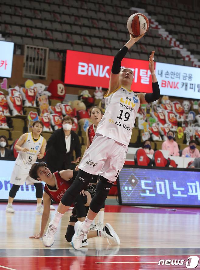 (부산=뉴스1) 여주연 기자 = 27일 오후 'KB국민은행 Liiv M 2020-2021 여자프로농구' 부산 BNK 썸과 청주 KB스타즈의 경기가 열린 부산 금정 BNK 센터에서 KB 박지수가 슛하고 있다. 2021.1.27/뉴스1