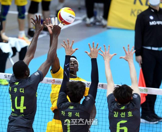 KB손해보험 케이타가 24일 의정부체육관에서 열린 2020-2021 V리그 KB손해보험과 현대캐피탈의 경기에서 밀어넣기 공격을 하고 있다.