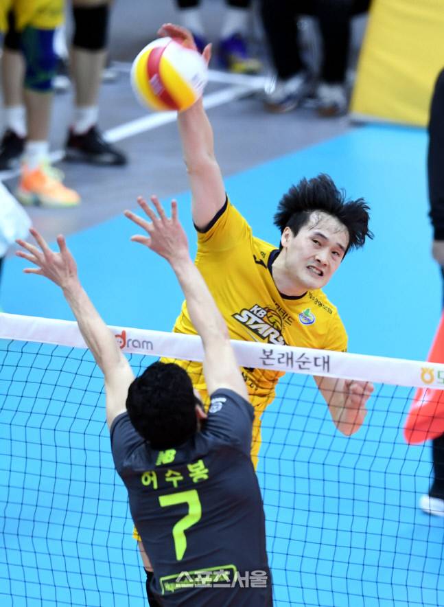 KB손해보험 김정호가 24일 의정부체육관에서 열린 2020-2021 V리그 KB손해보험과 현대캐피탈의 경기에서 스파이크를 날리고 있다.
