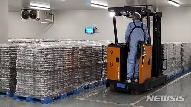 [여주=뉴시스]조수정 기자 = 27일 경기 여주시 해밀광역계란유통센터에서 한 관계자가 AI 확산으로 부족한 계란 수급을 위해 한국농수산식품유통공사가 수입한 미국산 수입 신선란(계란)의 식품 검사를 마친 뒤 도매업체 차량에 싣기 위해 지게차로 옮기고 있다. (사진=해밀 제공) 2021.01.27. photo@newsis.com