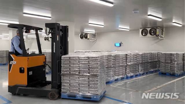 [여주=뉴시스]조수정 기자 = 27일 경기 여주시 해밀광역계란유통센터에서 한 관계자가 AI 확산으로 부족한 계란 수급을 위해 한국농수산식품유통공사가 수입한 미국산 수입 신선란(계란)의 식품 검사를 마친 뒤 도매업체 차량에 싣기 위해 지게차로 옮기고 있다. (사진=해밀 제공) 2021.01.27. photo@newsis.com