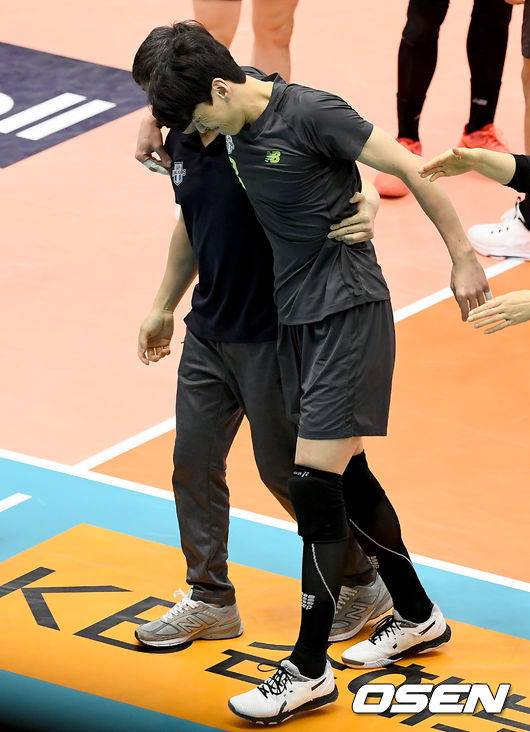 2세트 현대캐피탈 송준호가 부상을 당한 뒤 코트장 밖으로 이동하고 있다./ksl0919@osen.co.kr