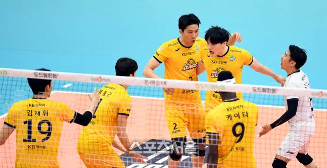 KB손해보험 김정호가 24일 의정부체육관에서 열린 2020-2021 V리그 KB손해보험과 현대캐피탈의 경기에서 서브로 득점을 올린 후 환호하고 있다.