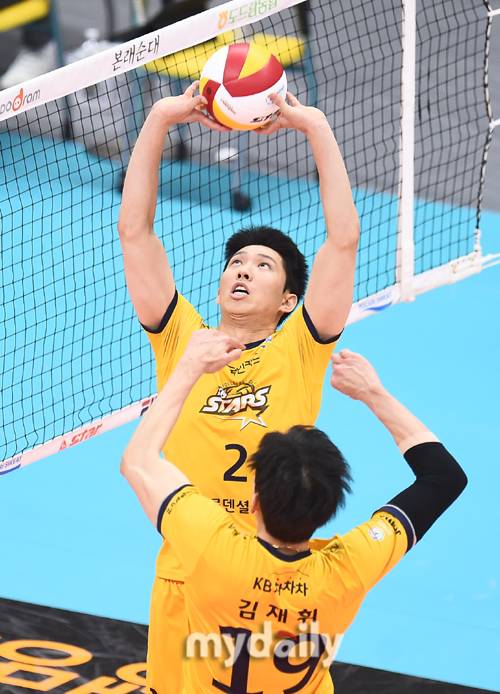 [마이데일리 = 의정부 곽경훈 기자] KB손해보험 황택의가 27일 오후 경기도 의정부체육관에서 진행된 '2020-2021 도드람 V-리그' KB손해보험-우리카드의 경기에서 수비를 하고 있다.- ⓒ마이데일리(www.mydaily.co.kr). 무단전재&재배포 금지 -