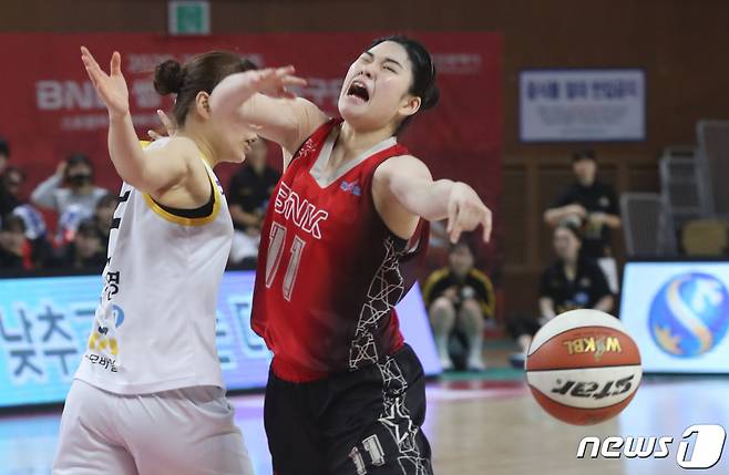 (부산=뉴스1) 여주연 기자 = 27일 오후 'KB국민은행 Liiv M 2020-2021 여자프로농구' 부산 BNK 썸과 청주 KB스타즈의 경기가 열린 부산 금정 BNK 센터에서 BNK 이소희가 공을 놓치고 있다. 2021.1.27/뉴스1