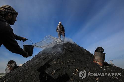 epa08968154 Palestinian charcoal workers throw water at a coal pile at Al-Hattab production facility near the border, in the Gaza Strip, 26 January 2021. Al-Hattab charcoal-making facility is the largest producer in the Gaza strip. Eight men work throughout the year, especially during winter and holiday periods when coal is in high demand. While workers cut down various types of trees, the citrus tree is very useful and the most expensive but the Al-Hattab workers don't focus on only one type of wood and work also with Elkinia and Olivewood. After harvesting the trees, workers shape the wood into a pyramid that is buried beneath the sand. The pyramid is set on fire, and it burns from the inside for several days. During this period, workers must control the burning by regularly moistening the pyramid with water. When the fire has subsided, the sand is cleared, leaving the burned wood exposed for 6 days. The workers are then able to harvest and clean the raw charcoal. The facility produces 80 to 90 tons of charcoal annually. At the end of the production process, customers can purchase bags of charcoal directly from the factory. One kilo is sold for US $ 1,50 on-site and US$2.50 in the markets. EPA/MOHAMMED SABER ATTENTION: This Image is part of a PHOTO SET