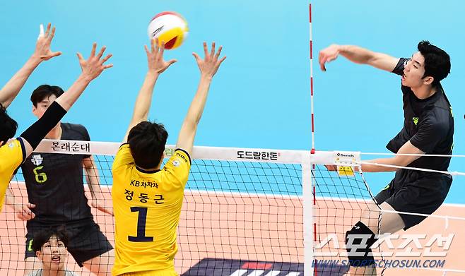 2020-2021 프로배구 V리그 KB손해보험과 현대캐피탈의 경기가 27일 의정부실내체육관에서 열렸다. 현대캐피탈 허수봉이 KB손해보험 정호근의 블로킹 사이로 스파이크를 강타하고 있다. 의정부=최문영 기자 deer@sportschosun.com /2021.01.27/