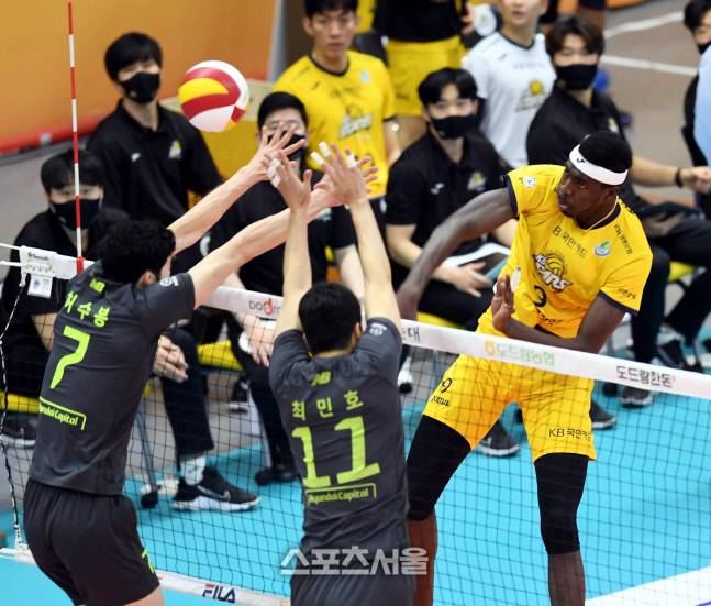 KB손해보험 케이타가 24일 의정부체육관에서 열린 2020-2021 V리그 KB손해보험과 현대캐피탈의 경기에서 스파이크를 날리고 있다.