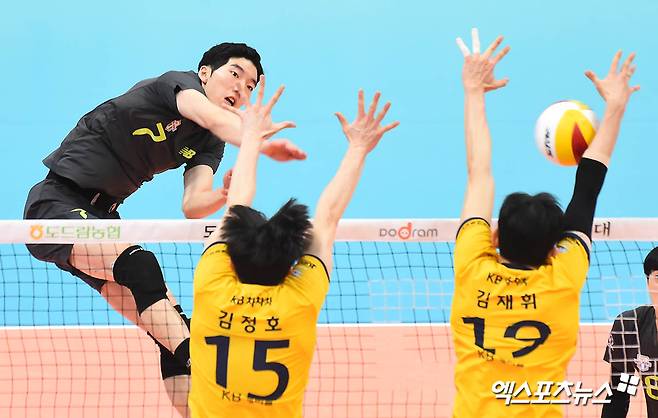 [엑스포츠뉴스 의정부, 윤다희 기자] 27일 오후 경기도 의정부실내체육관에서 열린 ‘2020-2021 도드람 V리그’ KB손해보험과 현대캐피탈의 경기, 현대캐피탈 허수봉이 공격을 시도하고 있다.