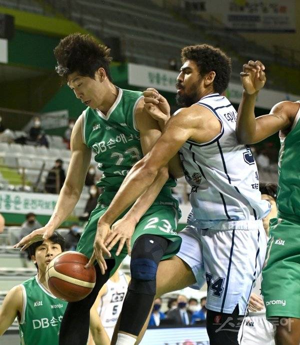 27일 원주종합체육관에서 열린 ‘2020-2021 현대모비스 프로농구’ 원주 DB와 전주 KCC 경기에서 KCC 데이비스가 DB 배강률이 리바운드 볼을 다투고 있다.