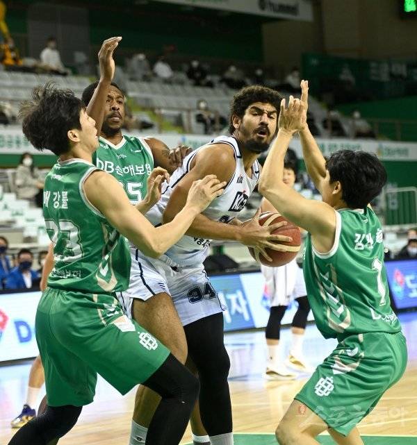 27일 원주종합체육관에서 열린 ‘2020-2021 현대모비스 프로농구’ 원주 DB와 전주 KCC 경기에서 KCC 데이비스가 DB의 수비를 뚫고 골밑을 공격하고 있다.