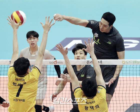 2020~2021 프로배구 V리그 남자부 KB손해보험과 현대캐피탈의 경기가 27일 오후 경기 의정부실내체육관에서 열렸다. 최민호가 스파이크 공격을 하고 있다.