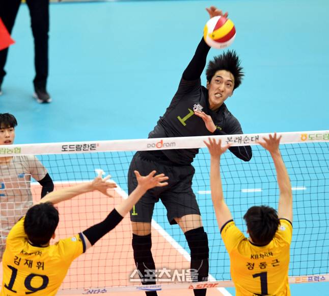 현대캐피탈 차영석이 24일 의정부체육관에서 열린 2020-2021 V리그 KB손해보험과 현대캐피탈의 경기에서 스파이크를 날리고 있다.