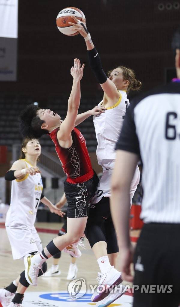 (부산=연합뉴스) 강덕철 기자 = 27일 부산 금정구 BNK 센터에서 열린 여자프로농구 부산 BNK와 청주 KB 경기. BNK 안혜지 슛이 KB 박지수 수비에 막히고 있다. 2021.1.27