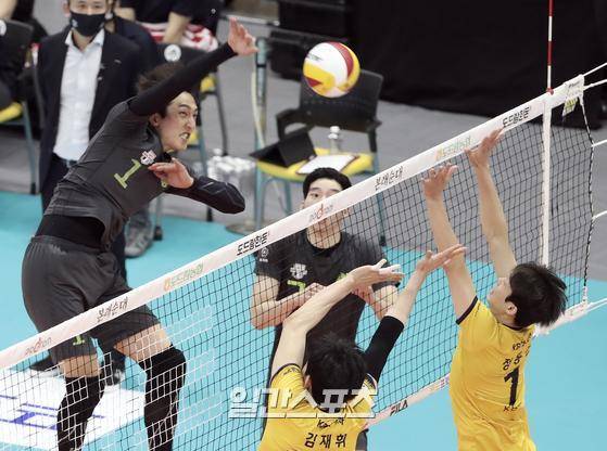 2020~2021 프로배구 V리그 남자부 KB손해보험과 현대캐피탈의 경기가 27일 오후 경기 의정부실내체육관에서 열렸다. 차명석이 스파이크를 날리고 있다.