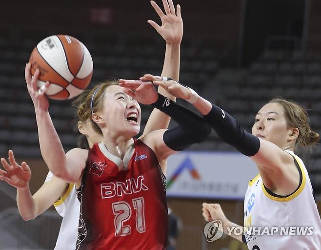 (부산=연합뉴스) 강덕철 기자 = 27일 부산 금정구 BNK 센터에서 열린 여자프로농구 부산 BNK와 청주 KB 경기. BNK 김진영이 레이업 슛을 시도하고 있다. 2021.1.27