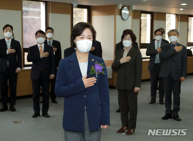 [서울=뉴시스]김병문 기자 = 추미애 전 법무부 장관이 27일 오후 경기 정부과천청사 법무부에서 열린 이임식에서 국민의례하고 있다. (사진=법무부 제공) 2021.01.27. photo@newsis.com