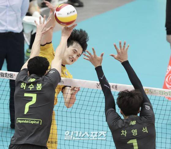 2020~2021 프로배구 V리그 남자부 KB손해보험과 현대캐피탈의 경기가 27일 오후 경기 의정부실내체육관에서 열렸다. 김정호가 스파이크 공격을 하고 있다.