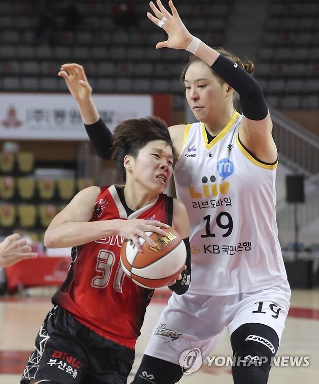 (부산=연합뉴스) 강덕철 기자 = 27일 부산 금정구 BNK 센터에서 열린 여자프로농구 부산 BNK와 청주 KB 경기. BNK 진안이 KB 박지수 수비에 맞서 돌파를 시도하고 있다. 2021.1.27