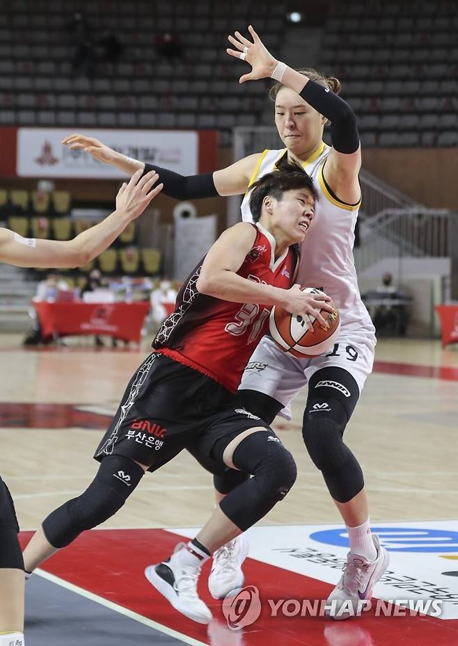 (부산=연합뉴스) 강덕철 기자 = 27일 부산 금정구 BNK 센터에서 열린 여자프로농구 부산 BNK와 청주 KB 경기. BNK 진안이 KB 박지수 수비에 맞서 돌파를 시도하고 있다. 2021.1.27