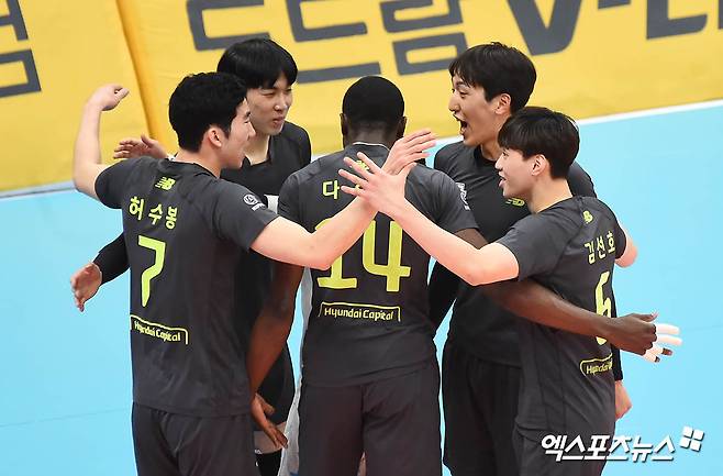[엑스포츠뉴스 의정부, 윤다희 기자] 27일 오후 경기도 의정부실내체육관에서 열린 ‘2020-2021 도드람 V리그’ KB손해보험과 현대캐피탈의 경기, 현대캐피탈 선수들이 득점 후 기쁨을 나누고 있다.