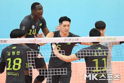 현대캐피탈 문성민이 동료들과 하이파이브 하고 있다. jh1000@maekyung.com