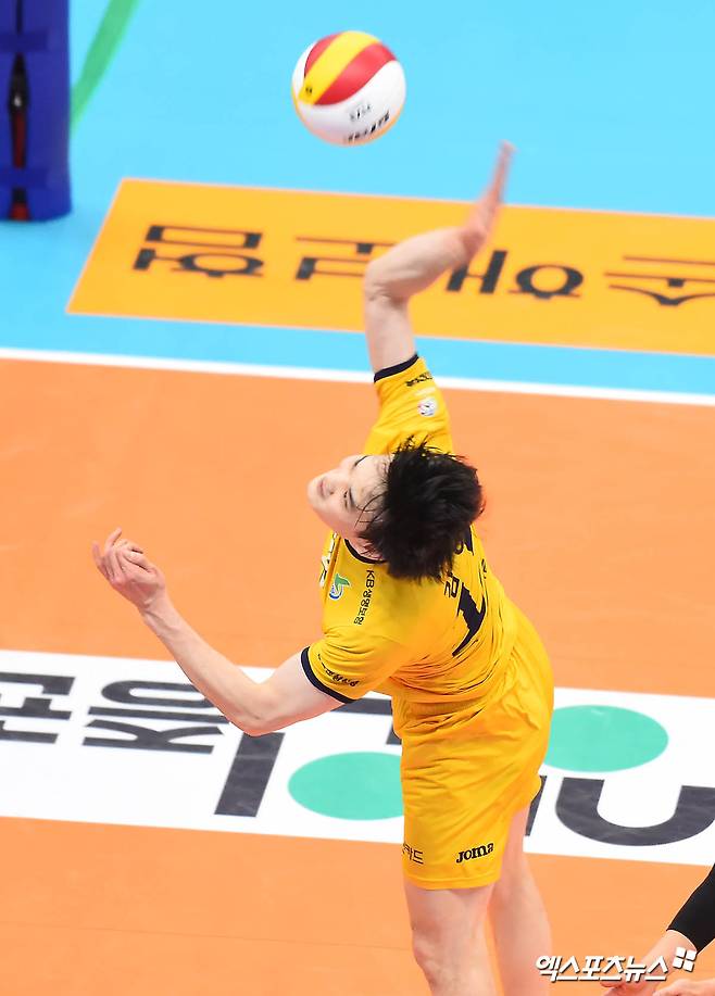 [엑스포츠뉴스 의정부, 윤다희 기자] 27일 오후 경기도 의정부실내체육관에서 열린 ‘2020-2021 도드람 V리그’ KB손해보험과 현대캐피탈의 경기, KB손해보험 김정호가 공격을 시도하고 있다.