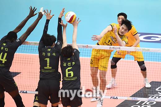 [마이데일리 = 의정부 곽경훈 기자] KB손해보험 김정호가 27일 오후 경기도 의정부체육관에서 진행된 '2020-2021 도드람 V-리그' KB손해보험-우리카드의 경기에서 공격을 시도하고 있다.- ⓒ마이데일리(www.mydaily.co.kr). 무단전재&재배포 금지 -