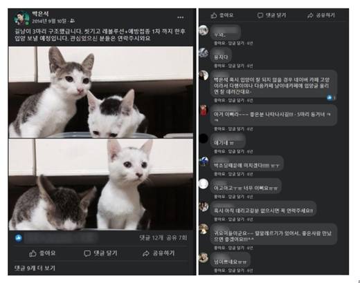 또한 "고양이 분양 관련해서도 경험담이라고 올라오는 글도 보았는데 이것은 뭔가 오해가 있는 듯 하다. 당시 은석이가 새끼고양이 입양할 분을 찾고 있던 것은 사실이나 본인이 데려온 아이를 다시 누구에게 넘기려고 한 것이 아니고 어미 잃은 아기고양이 3마리를 우연히 구조하게 되었고 그래서 키우실 수 있는 분을 찾게 된 것 뿐"이라며 당시 페이스북에 올렸던 사진과 글을 공유했다.