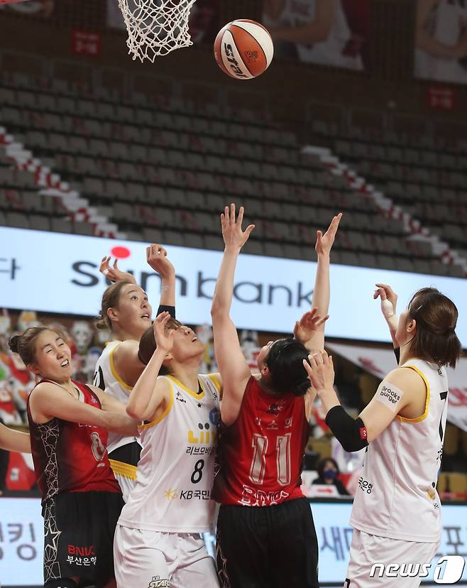 (부산=뉴스1) 여주연 기자 = 27일 오후 'KB국민은행 Liiv M 2020-2021 여자프로농구' 부산 BNK 썸과 청주 KB스타즈의 경기가 열린 부산 금정 BNK 센터에서 선수들이 리바운드 공을 잡고 있다. 2021.1.27/뉴스1