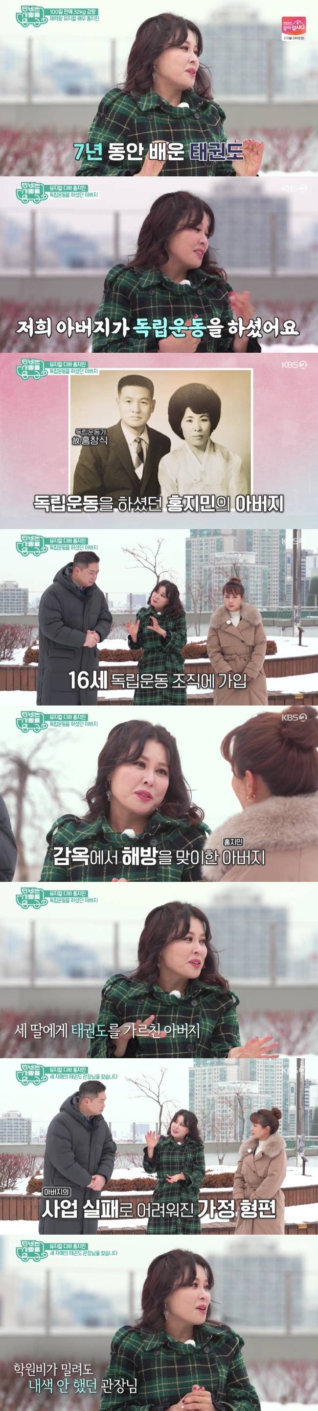 홍지민은 자신의 아버지가 독립운동가 고(故) 홍창식 선생이라고 밝혔다. 홍지민은 “아버님이 16살 때 백두산회라는 조직에 가입하셔서 거기서 독립운동을 하시다가 감옥에서 해방을 맞이하셨다”며 “아빠가 세 딸을 강인하게 키우고 싶어서 모두 태권도를 가르치셨다”고 설명했다.