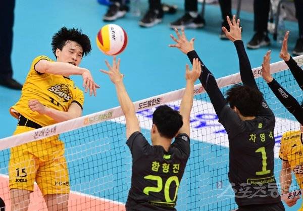 KB손해보험 김정호가 스파이크를 때리고 있다.