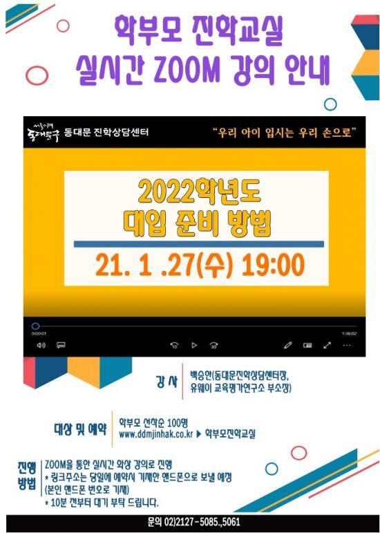 학부모 진학교실은 매월 마지막 주 수요일 동대문진학상담센터에서 운영하는 프로그램으로 백승한(유웨이 교육평가연구소 부소장) 진학상담센터 센터장이 '포스트코로나 시대에 맞는 2022학년도 대입 지원 전략'을 주제로 진행한다.