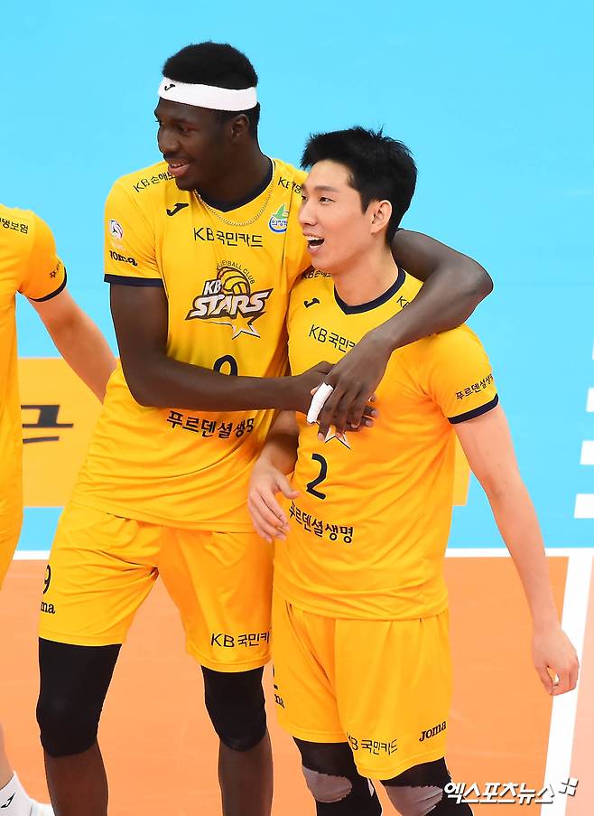 KB손해보험 케이타, 황택의가 득점 후 기쁨을 나누고 있다.
