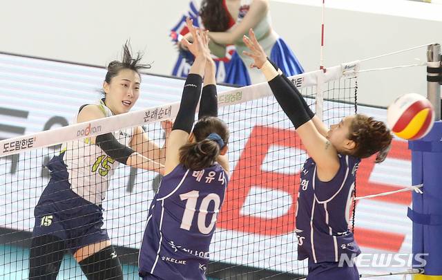 [서울=뉴시스]김병문 기자 = 27일 오후 경북 김천실내체육관에서 열린 도드람 2020-2021 V리그 현대건설과 도로공사와의 경기, 현대건설 황민경이 공격을 시도하고 있다. (사진=현대건설 배구단 제공) 2021.01.27. photo@newsis.com