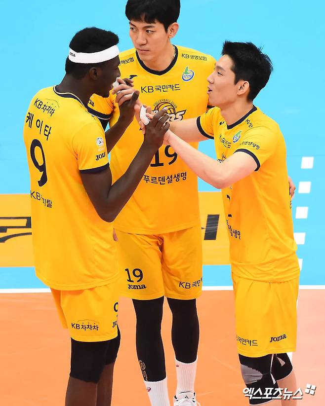 KB손해보험 케이타, 황택의가 득점 후 기쁨을 나누고 있다.
