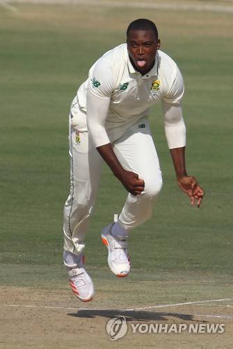 epa08968306 South African bowler Lungi Ngidi bowls during the second day of first cricket test match between Pakistan and South Africa in Karachi, Pakistan, 27 January 2021. The South African cricket squad arrived in Pakistan for their first tour consisting of two Test and three T20 matches after a 14-year break. EPA/SHAHZAIB AKBER
