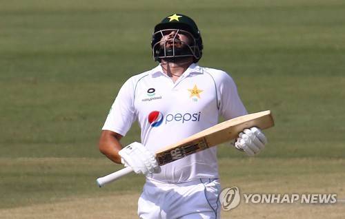 epa08968317 Pakistani batsman Azhar Ali celebrates his half century during the second day of first cricket test match between Pakistan and South Africa in Karachi, Pakistan, 27 January 2021. The South African cricket squad arrived in Pakistan for their first tour consisting of two Test and three T20 matches after a 14-year break. EPA/SHAHZAIB AKBER