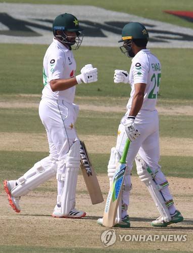 epa08968325 Pakistani batsmen Fawad Alam (R) and Azhar Ali in action during the second day of first cricket test match between Pakistan and South Africa in Karachi, Pakistan, 27 January 2021. The South African cricket squad arrived in Pakistan for their first tour consisting of two Test and three T20 matches after a 14-year break. EPA/SHAHZAIB AKBER