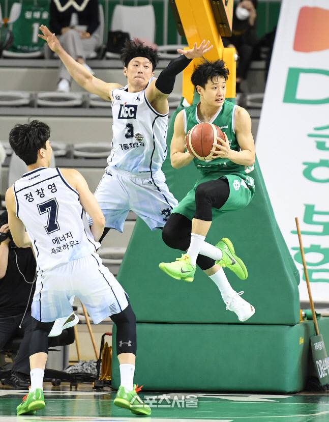 DB 허웅(오른쪽)이 27일 원주종합체육관에서 열린 2020-2021 프로농구 원주 DB와 전주 KCC의 경기에서 골밑으로 파고들다가 KCC 이정현에 막혀 슛이 여의치않자 외곽의 김영훈에 패스를 하고 있다. 김영훈의 역전 결승 3점슛으로 이어지는 어시스트. 2021. 1. 27.