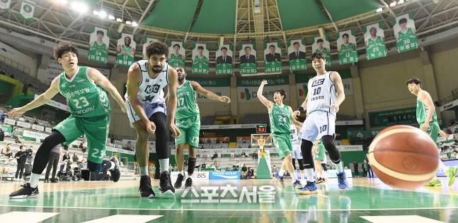 KCC 타일러 데이비스(왼쪽 둘째)가 27일 원주종합체육관에서 열린 2020-2021 프로농구 원주 DB와 전주 KCC의 경기에서 자신을 맞고 아웃되는 공을 바라보고 있다. 2021. 1. 27.