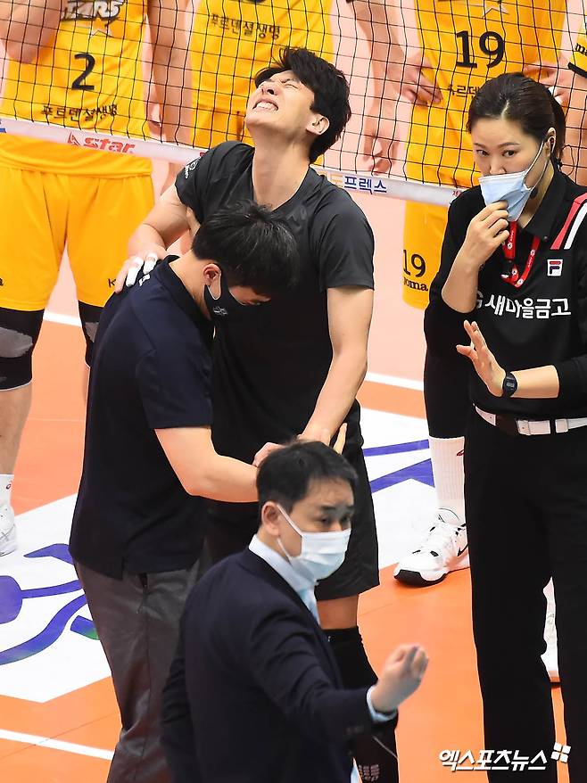 현대캐피탈 송준호가 고통을 호소하고 있다.
