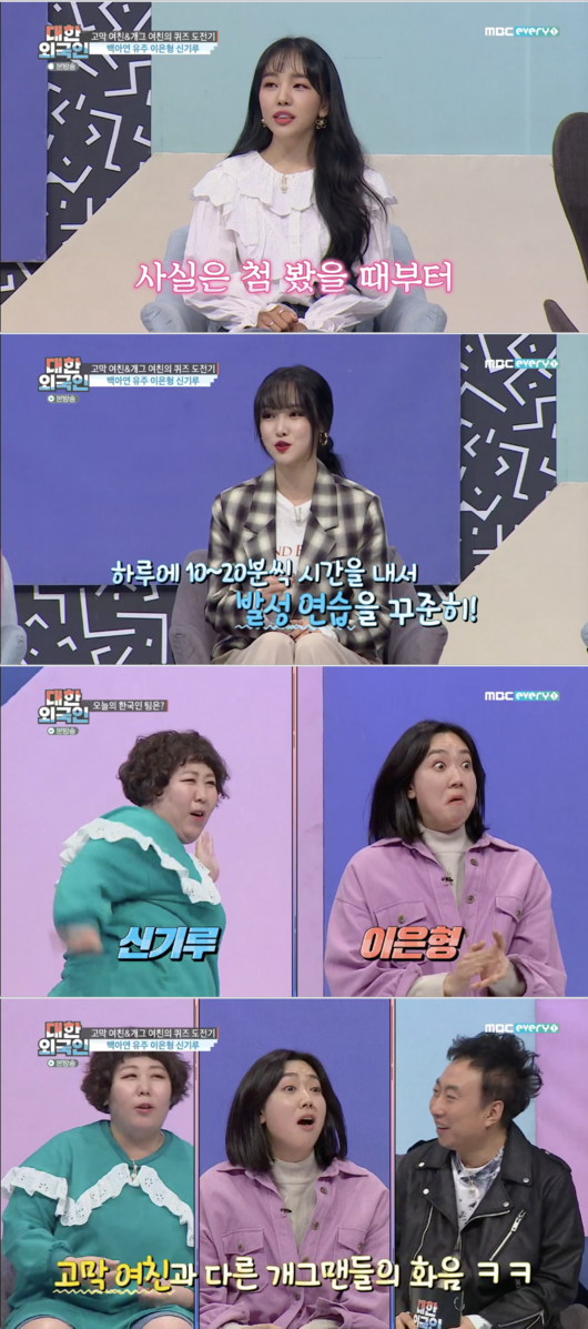 27일 방송된 MBC에브리원 ‘대한외국인’에 ‘고막 여친’ 백아연, 여자친구 유주와 ‘개그 여친’ 이은형, 신기루가 출연해 퀴즈 대결을 펼쳤다.