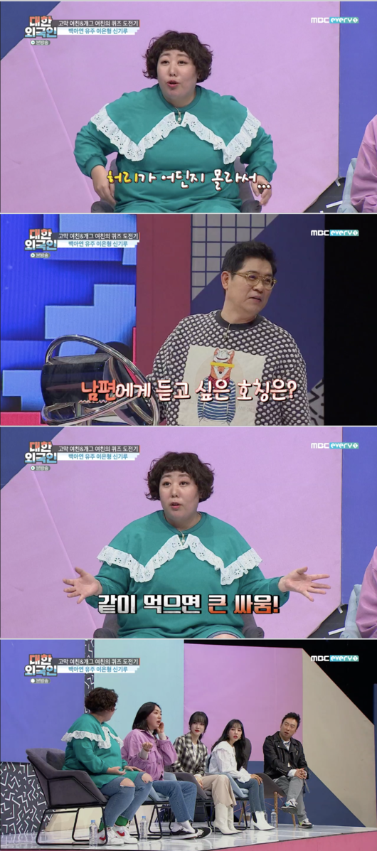 남편에게 듣고싶은 호칭에 이은형은 “선배소리를 듣고 싶다”라며 “옛날엔 선배라고 했는데 이제는 '야, 너, 눈깔'이라고 말한다"고 해서 웃음을 자아냈다.