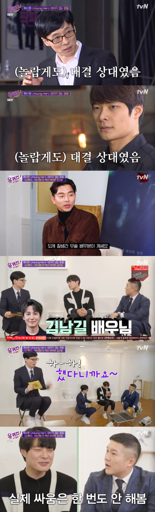 이어 공유가 인정한 잘생긴 무술 배우 김선웅이 나왔다. 그는 ‘신의 한수’, ‘아수라’, ‘밀정’, ‘부산행’, ‘도깨비’ 등에서 무술 감독으로 활약했는데 “액션이 잘 나오는 건 당연하고 대역 티가 안 나도록 체격을 조절해야 한다. 몸 동작을 유심히 관찰해서 특징을 파악한다. 얼굴이 비슷하면 유리하다. 슬쩍 측면으로 찍을 수 있으니까. 할리우드에는 계약 조건으로도 써 있다”고 밝혔다.