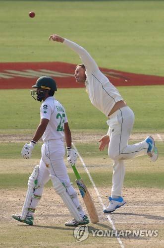 epa08968519 South African bowler George Linde bowls during the second day of first cricket test match between Pakistan and South Africa in Karachi, Pakistan, 27 January 2021. The South African cricket squad arrived in Pakistan for their first tour consisting of two Test and three T20 matches after a 14-year break. EPA/SHAHZAIB AKBER