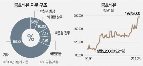 분수령은 오는 3월 주주총회가 될 것으로 보인다. 3월 금호석화 사외이사 7명 중 절반이 넘는 4명의 임기가 만료된다. 박 상무는 사외이사 교체를 요구하며 자신에게 우군이 될 만한 인물을 이사 후보로 공식 추천할 것으로 관측된다. 금호석화 측은 “표명할 입장이 없다”고 말했다.
