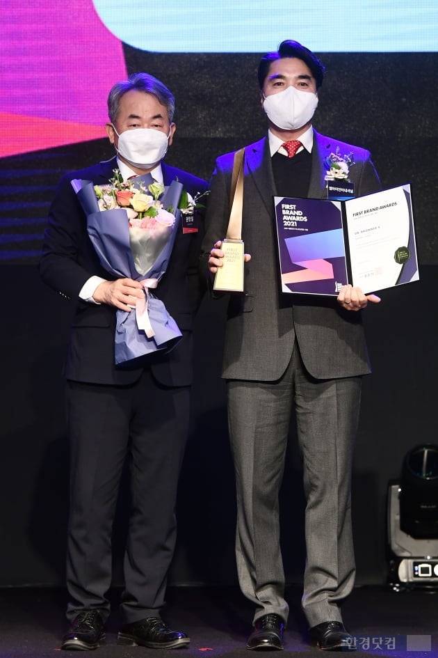 한국소비자브랜드위원회가 주최하고 한국경제신문, 한국소비자포럼이 주관하는 '2021 대한민국 퍼스트브랜드 대상 시상식'이 27일 오후 서울 여의도 콘래드호텔에서 열렸다. 립케어, 클렌징폼 부문을 수상한 엠아이인터내셔널(브랜드명 닥터 브로너스) 이정섭 대표(오른쪽)와 권영설 한국경제신문 사업국장이 포즈를 취하고 있다.